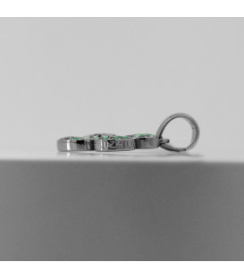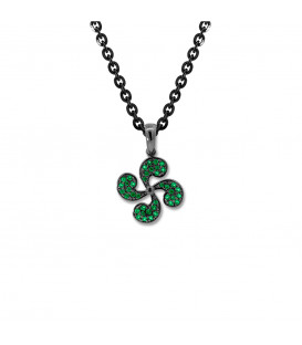 Colgante Lauburu elaborado en Plata de 1ª Ley (925mm) recubierto de un sofisticado baño de rutenio que realza su diseño y aporta un acabado moderno y elegante. La pieza está engastada con 40 circonitas verdes de 1mm, que aporta brillo y contraste, convirtiéndola en una joya llena de carácter y simbolismo. Diámetro del Lauburu: 19mm. Medidas de la reasa: Alto 8mm y ancho 3mm. Cadena no incluida