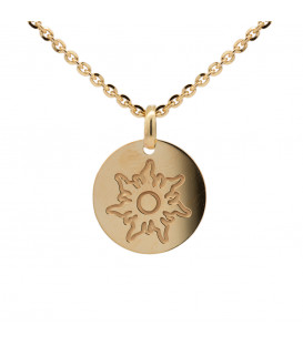 Colgante medalla Mountain de Plata de 1ª Ley (925mm) bañado en oro de 18kt. en acabado brillo y motivo Eguzkilore grabado en el centro. Posibilidad de grabar un nombre corto o fecha en la parte de atrás. Diámetro Medalla: 18mm. Medida reasa: 6mm alto y 5mm ancho. Cadena no incluida.