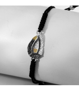 Pulsera de hilo negro con cierre macramé con motivo central con forma de la almendra de Vitoria-Gasteiz de Plata de 1ª Ley (925mm) bicolor plata y rutenio con diferentes acabados. Contiene dos láminas de oro de 18kt. (750mm). Contiene bolitas de Plata decorativas en los extremos. Pulsera de cierre corredizo para ajustarlo a la medida deseada. Medida pulsera abierta: 23cm. Medida almendra: alto 15mm y ancho 11mm.