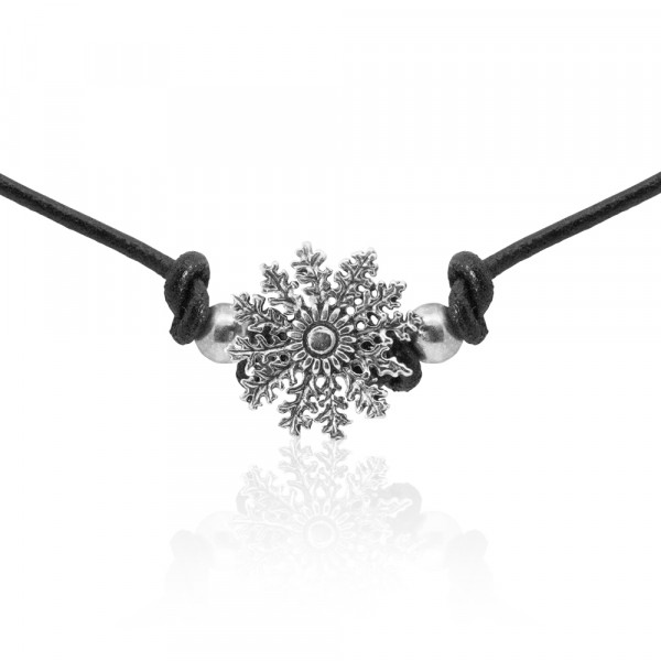 Gargantilla con cordón de cuero negro de bisutería (Zamak) con Eguzkilore en brillo oxidado en la parte central. Medida del collar: 44cm. Diámetro del Eguzkilore: 19mm.