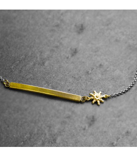 Gargantilla Zubi de Plata de 1ª Ley (925mm) con chapa central bañada en oro 18kt. y Eguzkilore en la parte izquierda de la pieza. La cadena es tipo rolo y tiene cierre marinero. Largura gargantilla: 42cm. Medida chapa: alto 4mm y ancho 40mm. Diámetro Eguzkilore: 9mm. Opción de personalizar con un nombre o fecha en la parte delantera.