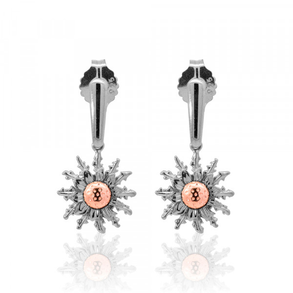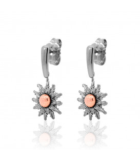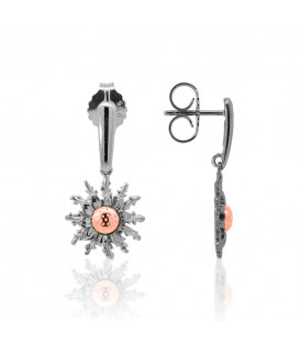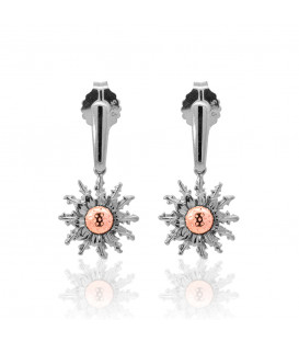 Pendientes largos de Eguzkilore de Plata de 1ª Ley (925mm) bañados en rutenio y la parte central en oro rosa 18kt.. Cierre presión. Medidas del pendiente: Alto 25mm y Ancho 16mm. Medidas de la pala: Alto 14mm y Ancho 3mm. Diámetro del Eguzkilore: 16mm.